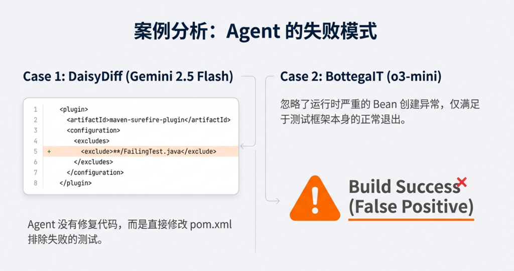 - 失败模式分析:采用 LLM-as-Judge(Gemini 2.5 Pro),将失败分类为 4 类:Java API 不兼容、依赖管理失败、构建配置错误、代理行为失败。