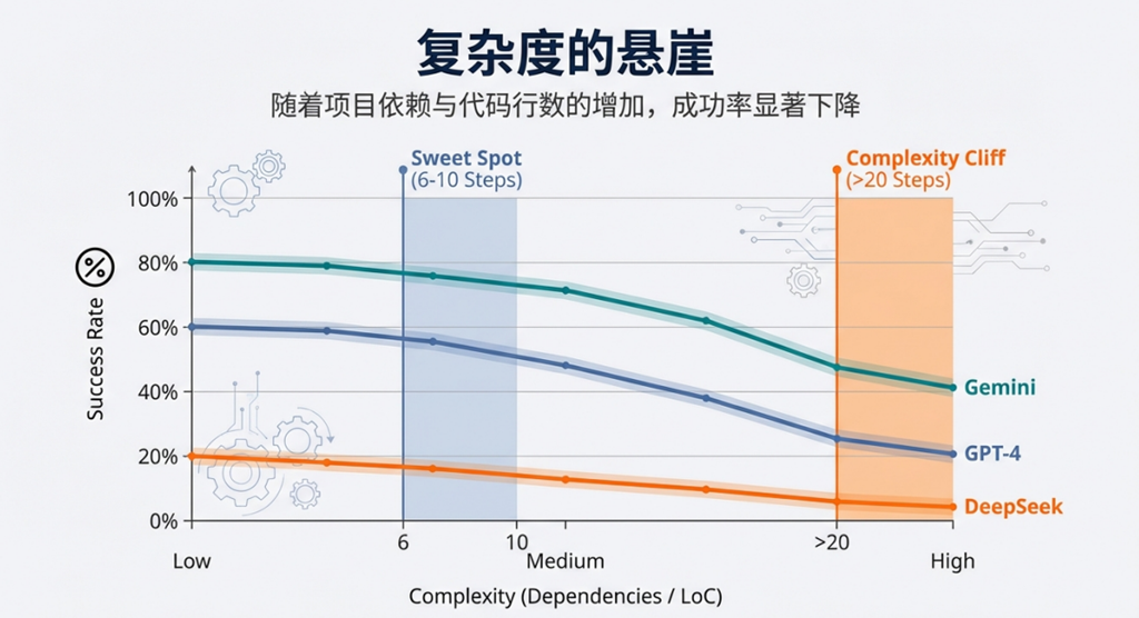 所有模型的成功率随项目复杂度(依赖数量、代码行数、测试用例数)增加而下降,验证了基准对真实场景复杂性的覆盖能力。