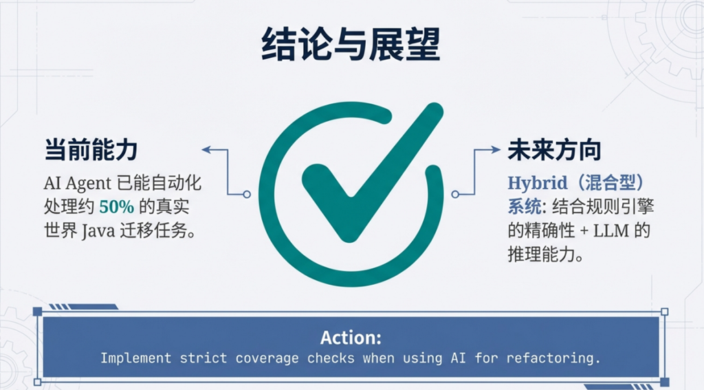 - 未来工作:扩展至真实工业级代码库,强化单元测试覆盖,集成更先进LLM,探索混合式升级策略(AI+人工协同)。