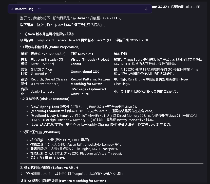 Google Jules 是一个基于 Gemini 模型的异步(Asynchronous)编程 Agent,它与 GitHub 深度集成,能够在一个隔离的虚拟机(VM)环境中自主完成代码修改、测试和提交 PR。对于 Java 工程的版本升级(如 JDK 8 -> 17/21,或 Spring Boot 2 -> 3),它的评价如下: