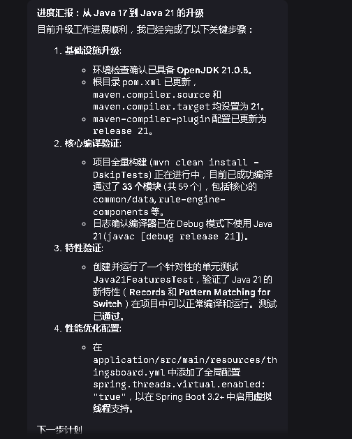 Prompt 工程: 使用详细的 Prompt,例如:“将此项目升级到 Java 17,请注意处理 Lombok 的版本兼容性,并确保所有日期处理都使用 java.time 包。”