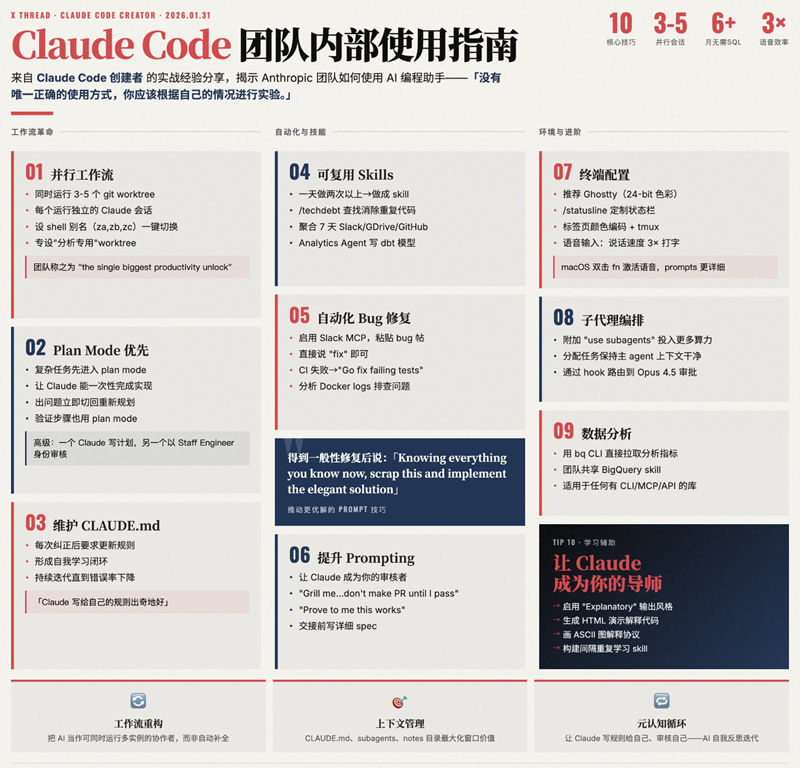 Claude Code(Anthropic 推出的 AI 命令行编程工具)的团队内部使用指南。它系统地总结了高效使用该工具的 10 个核心技巧,旨在将 AI 从简单的“自动补全”提升为“协同开发者”。