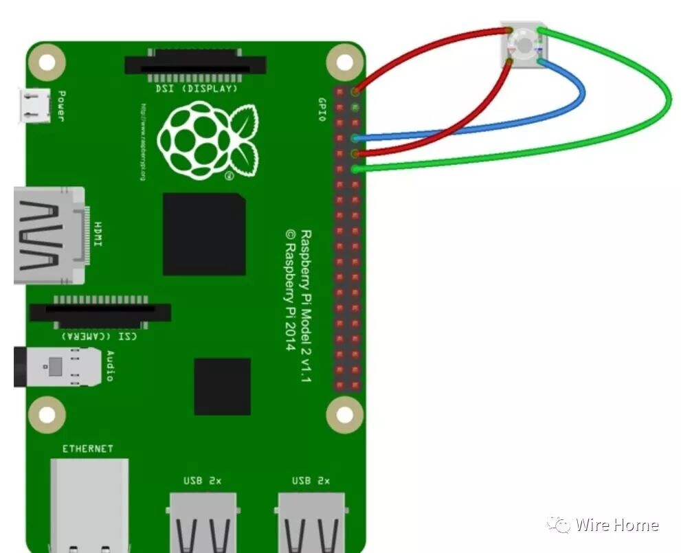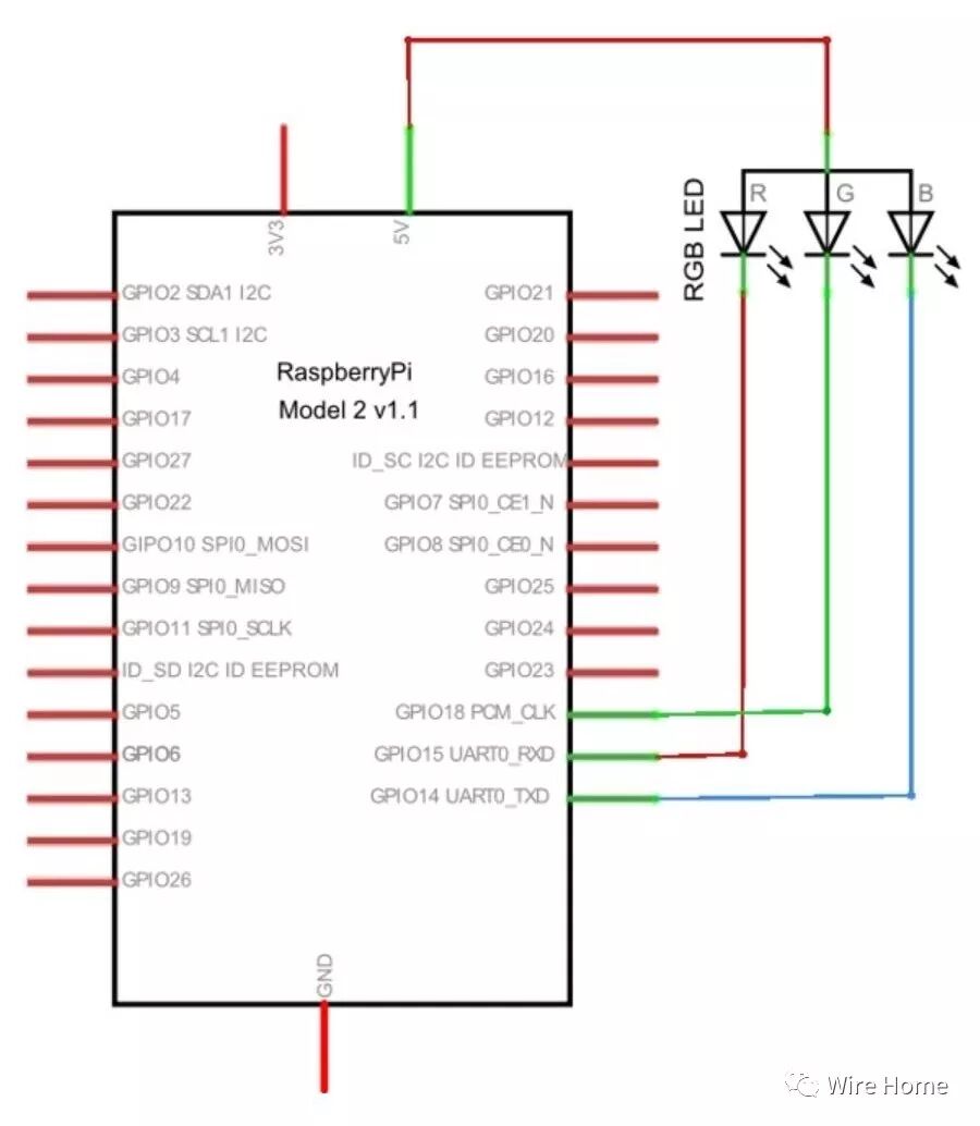 LED灯上的4根引脚分别是VCC,R,G,B。 VCC需要接到电源正极。我们把它连到树莓派的5V引脚上。 R,G,B分别是红绿蓝灯的负极接口。我们把它们连接到树莓派的GPIO口上。 然后跟前一篇一样,使用PWM来控制3个小灯的明暗程度即可混合出各种不同颜色的光。