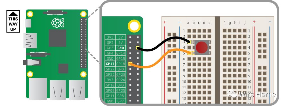 使用面包板和跳线,将Pi连接到按钮,如下图所示: