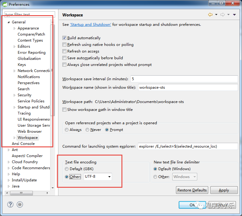 接下来配置工作空间的编码格式,安装好STS后,默认的编码是GBK,建议修改成UTF-8,具体配置方法如下: