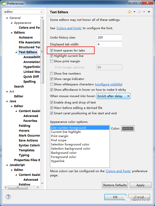 点击Text Editors进行设置,将Insert spaces for tabs勾上;