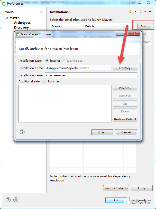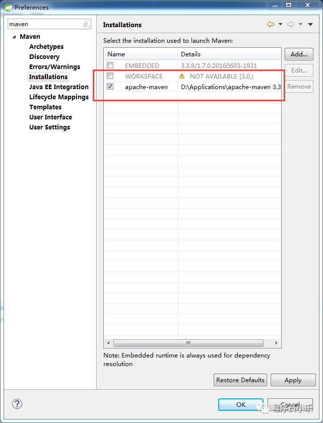 点击Installations进行设置,点击Add按钮,选择本机的maven路径后保存;