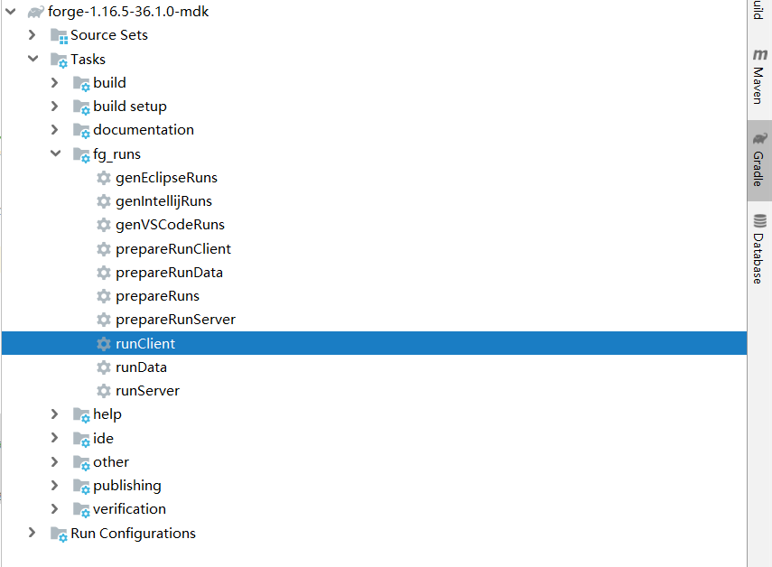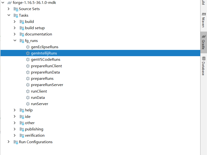 3.初始化完成之后,点击idea右侧Gradle,双击Tasts-fg_runs的genIntellijRuns