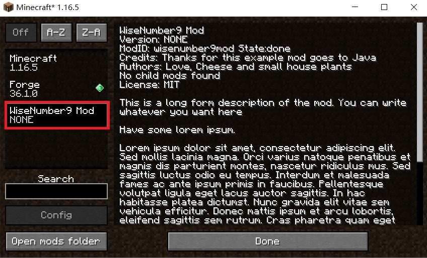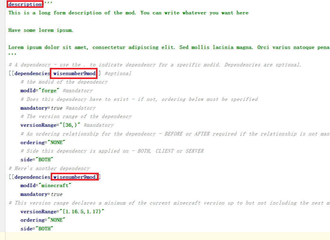 3.description就是mod的描述,然后下面两个dependencies后面的单词改成跟modId一样