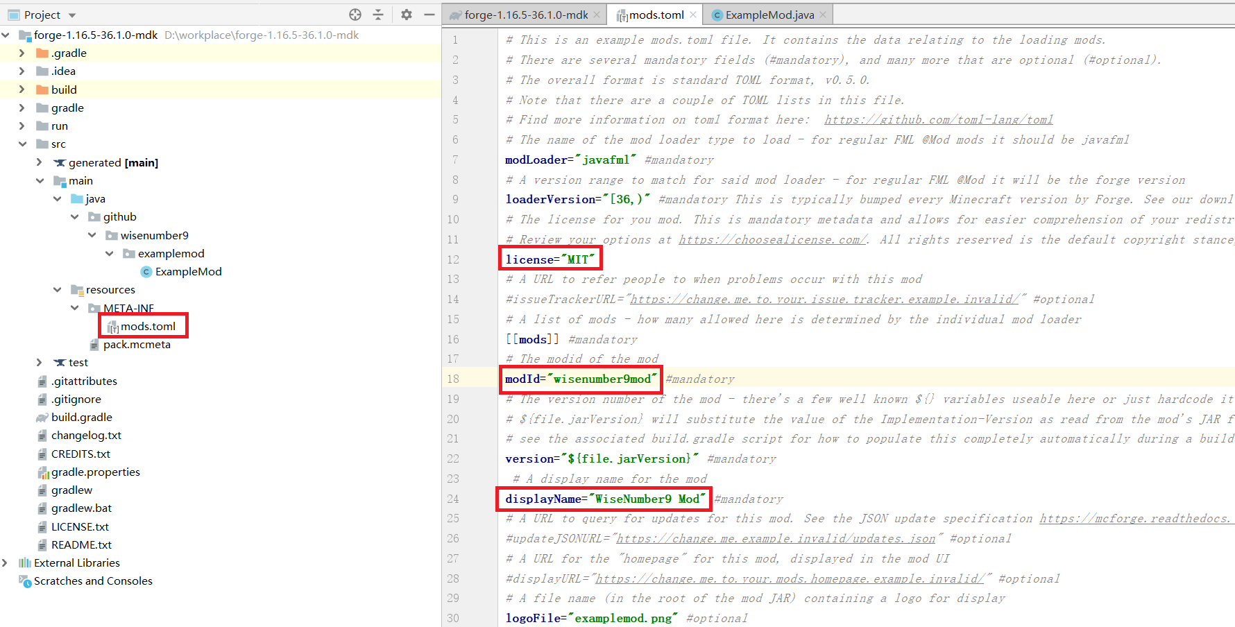2.打开mods.toml,可以修改一下许可证(license),modId改成跟上一步一样的,displayName就是mod要展示的名字