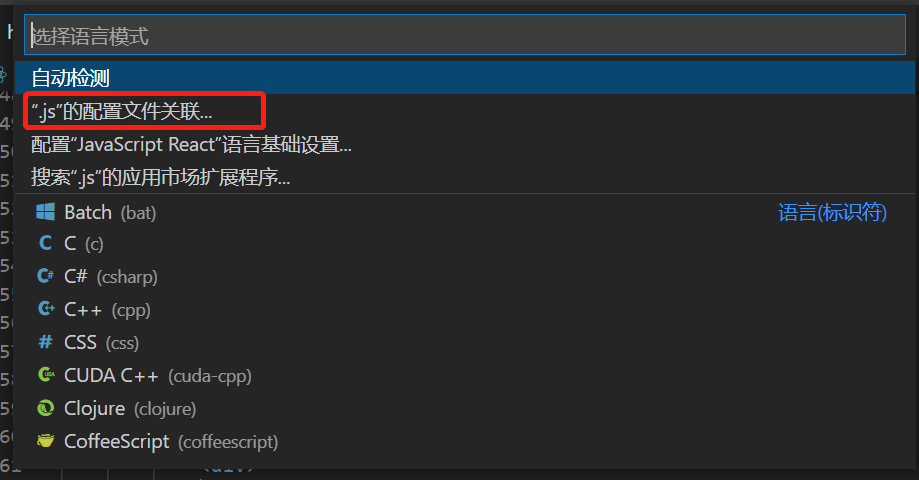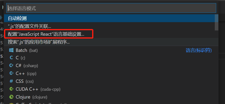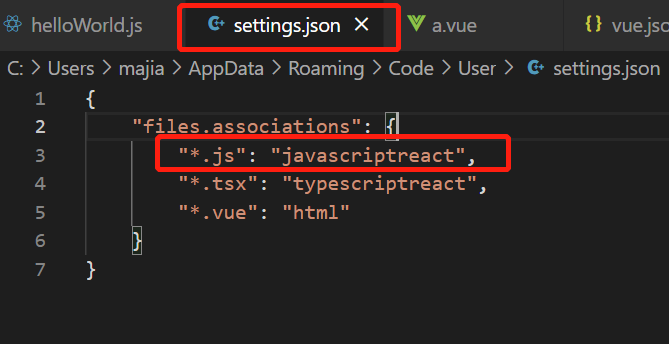 可以看到,*.js文件设置成了javascriptreact 文件(可切换文件格式),所以设置.js 文件中的快捷代码片段是在 javascriptreact.json 中(javascriptreact.json设置见vscode快捷开发二)