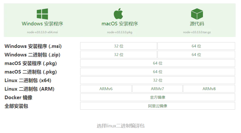 我们先打开nodejs下载页面:http://nodejs.cn/download/,选择合适的linux版本编译包