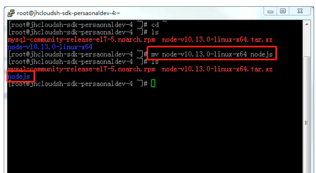 cd ~ mv node-v10.13.0-linux-x64 nodejs