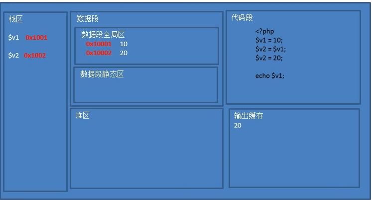 2/3、执行$v2=$v1;再栈区开辟一个空间存储变量$v2,读取变量$v1的值,读取出来保存在数据段全局区,讲这个保存的地址赋值栈区中变量$v2