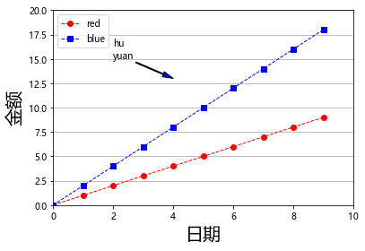 1 plt.figure() 2 3 x = np.arange(10) 4 y = np.arange(10)*2 5 6 plt.plot(x,marker='o',linestyle='dashed',linewidth=1,color='r',label='red') 7 plt.plot(y,marker='s',linestyle='dashed',linewidth=1,color='b',label='blue') 8 9 plt.xlim(0,10) 10 plt.ylim(0,20) 11 #plt.xticks(rotation=45) 12 plt.xlabel('日期',fontsize=20) 13 plt.ylabel('金额',fontsize=20) 14 plt.grid(True,axis='y') 15 plt.annotate('hu\nyuan',xy=(4,13),xytext=(2,15),arrowprops=dict(facecolor='blue',width=1,headwidth=6)) 16 plt.legend(loc='best') 17 #plt.legend(loc='upper left')
