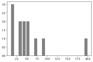 1 plt.figure() 2 x=[1,1,4,1,5,7,3,3,5,4,9,20] 3 plt.hist(x,bins=20,rwidth=0.8,color='gray')