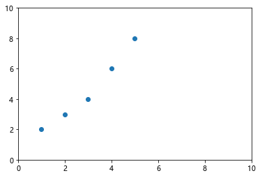 1 plt.figure() 2 3 x=[1,2,3,4,5] 4 y=[2,3,4,6,8] 5 plt.scatter(x,y) 6 plt.xlim(0,10) 7 plt.ylim(0,10)