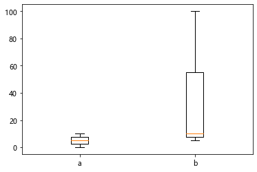 1 plt.figure() 2 3 x=[[0.1,5,10],[5,10,100]] 4 y=['a','b'] 5 plt.boxplot(x,labels=y)