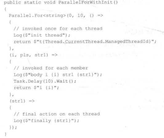 2.Parallel.For<TLocal>() 初始化 除了from to参数外 还定义了3个委托参数 "开始" "委托方法" "结束"