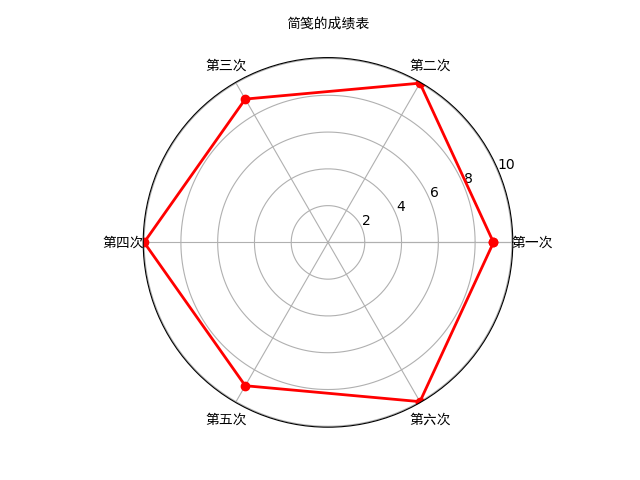 import numpy as np import matplotlib.pyplot as plt import matplotlib labels = np.array(['第一次','第二次','第三次','第四次','第五次','第六次']) dataLenth = 6 data = np.array([9,10,9,10,9,10]) angles = np.linspace(0, 2*np.pi, dataLenth, endpoint=False) data = np.concatenate((data, [data[0]])) angles = np.concatenate((angles, [angles[0]])) fig = plt.figure() ax = fig.add_subplot(111, polar=True) ax.plot(angles, data, 'ro-', linewidth=2) ax.set_thetagrids(angles * 180/np.pi, labels, fontproperties="SimHei") ax.set_title("简笺的成绩表", va='bottom', fontproperties="SimHei") ax.grid(True) plt.show()