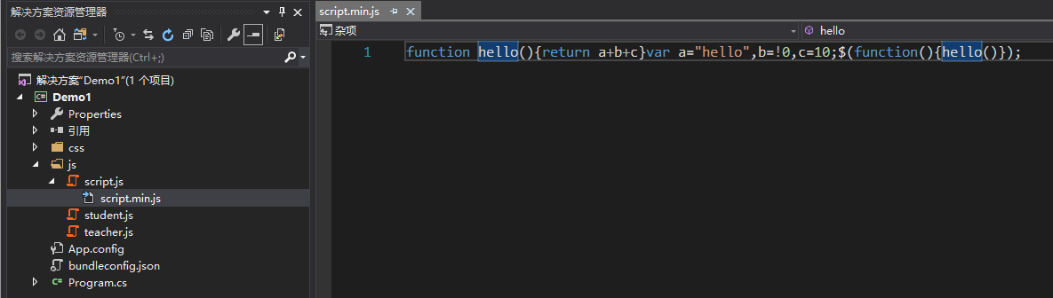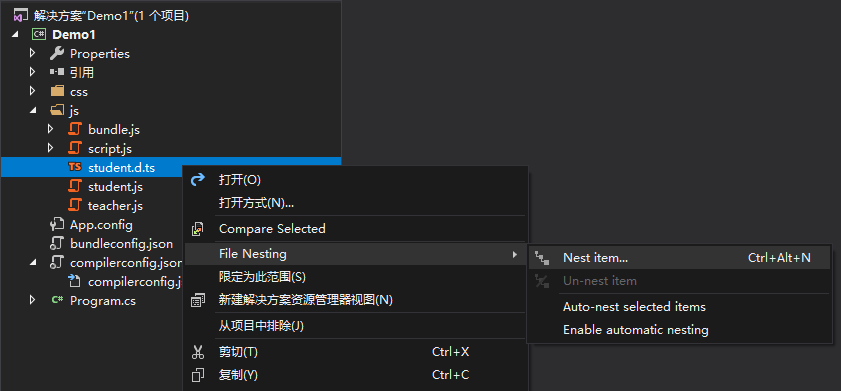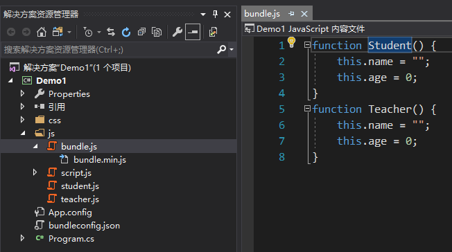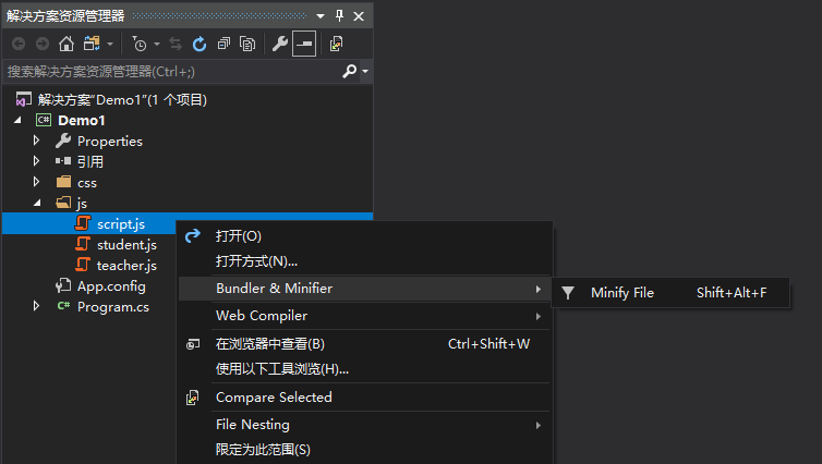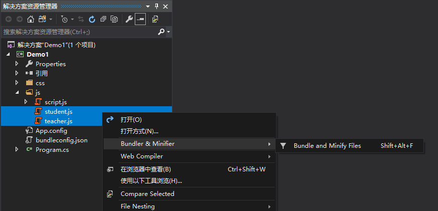 选中要合并的文件,点击右键,选择【Bundler & Minifier】-【Bundle and Minify Files】