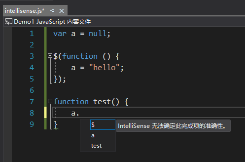 由于js是弱类型的原因,VS很难去识别一个变量的数据类型,除非你在变量定义的最初就赋值了一个明确类型的初始值,否则VS很难去判断这个变量在后续处于什么类型。