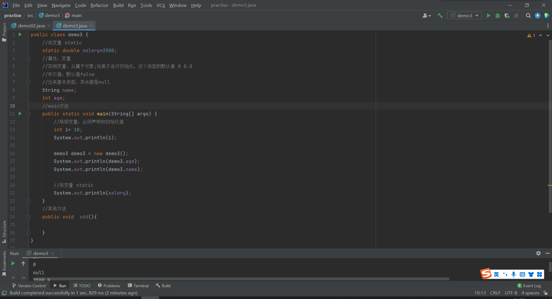 实例变量:从属于对象;如果不自行初始化,这个类型的默认值 0 0.0