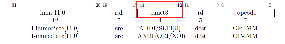 比如ADDI指令中的func3域只占用3位,并且与SLTI/SLTU的值相同:
