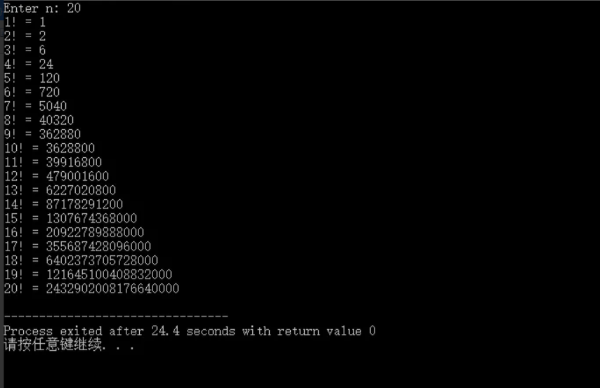 printf("%d! = %lld\n", i, fac(i));