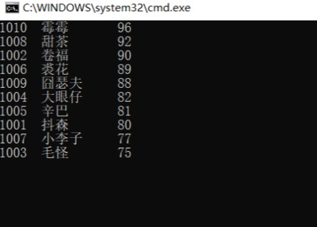 1、在屏幕上正确输出了按分数由高→低排序的信息,且生成了文本文件file3.dat。2、用记事本程序打开文件file3.dat,里面的数据信息是正确的,并且是直观可读的。