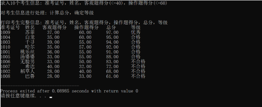 #include <stdio.h> #include <string.h> #include <stdlib.h> const int N = 10; // 定义结构体类型struct student,并定义其别名为STU typedef struct student { long int id; char name[20]; float objective; /*客观题得分*/ float subjective; /*操作题得分*/ float sum; char level[10]; }STU; // 函数声明 void input(STU s[], int n); void output(STU s[], int n); void process(STU s[], int n); int main() { STU stu[N]; printf("录入%d个考生信息: 准考证号,姓名,客观题得分(<=40),操作题得分(<=60)\n", N); input(stu, N); printf("\n对考生信息进行处理: 计算总分,确定等级\n"); process(stu, N); printf("\n打印考生完整信息: 准考证号,姓名,客观题得分,操作题得分,总分,等级\n"); output(stu, N); return 0; } // 从文本文件examinee.txt读入考生信息:准考证号,姓名,客观题得分,操作题得分 void input(STU s[], int n) { FILE *fin; int i; fin = fopen("examinee.txt", "r"); for(i=0; i<N; i++) fscanf(fin, "%d %s %f %f", &s[i].id, s[i].name, &s[i].objective, &s[i].subjective); fclose(fin); } // 输出考生完整信息: 准考证号,姓名,客观题得分,操作题得分,总分,等级 // 不仅输出到屏幕上,还写到文本文件result.txt中 void output(STU s[], int n) { FILE *fout; int i; fout = fopen("result.txt", "wb"); printf("准考证号 姓名 客观题得分 操作题得分 总分 等级\n"); // 将排序后的数组st中数据输出到屏幕 for(i=0;i<n;i++) printf("%4ld %6s %5.2f %.2f %6.2f %4s\n", s[i].id, s[i].name, s[i].objective, s[i].subjective, s[i].sum, s[i].level); // 将排序后的数组st中数据写到二进制文件file4.dat fwrite(s, sizeof(s), N, fout); // 将从地址st开始的sizeof(STU)×N个字节信息写入fout指向的文件result.txt中 fclose(fout); // 关闭fout指向的文件result.txt } // 对考生信息进行处理:计算总分,排序,确定等级 void process(STU s[], int n) { int i,j; STU t; for(i=0;i<n;i++) s[i].sum=s[i].objective+s[i].subjective; for(i=0;i<n-1;i++){ for(j=0;j<n-1-i;j++) if(s[j].sum<s[j+1].sum){ t=s[j]; s[j]=s[j+1]; s[j+1]=t; } } for(i=0;i<n;i++){ if(i<1) strcpy(s[i].level,"优秀"); else if(i>=1&&i<=5) strcpy(s[i].level,"合格"); else strcpy(s[i].level,"不合格"); } }