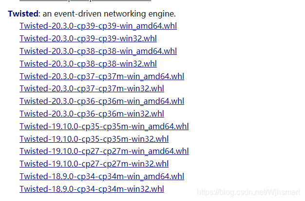 可以看到博主的版本是3.8.2版本的。那么怎么找对应的 Twisted 呢?Twisted-20.3.0-cp38-win_amd64whl。你只需要看红色部分,cp38表示对应的是3.8版本的。amd64和win32的区别就是区分是64的操作系统还是32的操作系统。