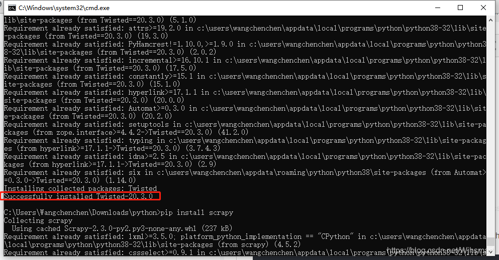 出现Successfully说明安装成功了,再执行下面的命令安装 scrapy。
