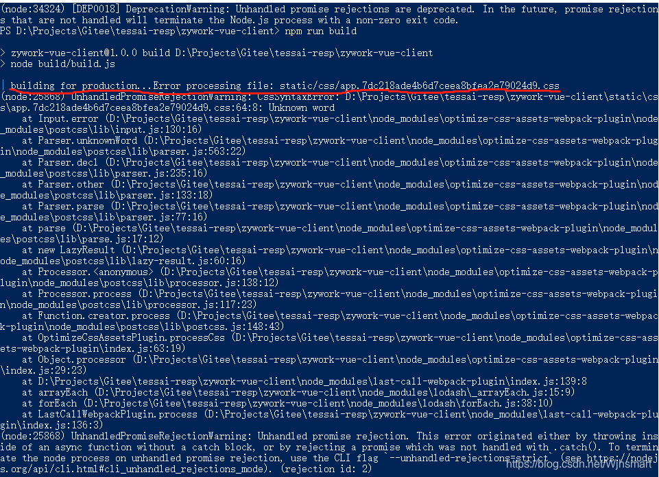 开发vue项目由于引入了第三方的css,发现执行 npm run build 命令打包时,报错: building for production...Error processing file: static/css/app.7dc218ade4b6d7ceea8bfea2e79024d9.css 。但是执行 npm run dev 是没有问题的。百思不得其解,后来查了相关资料后发现是因为压缩css语法错误的原因。写篇博客记录一下解决教程。