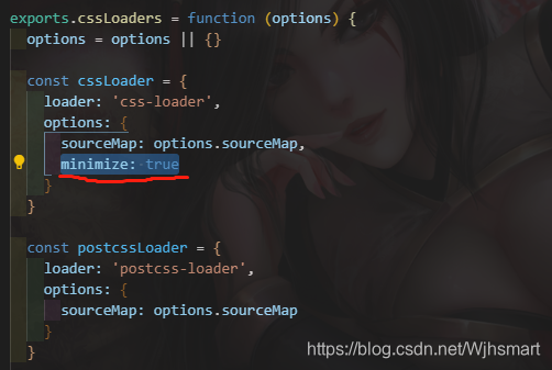 找到 cssLoader 配置,加上以下画红线的代码:minimize: true