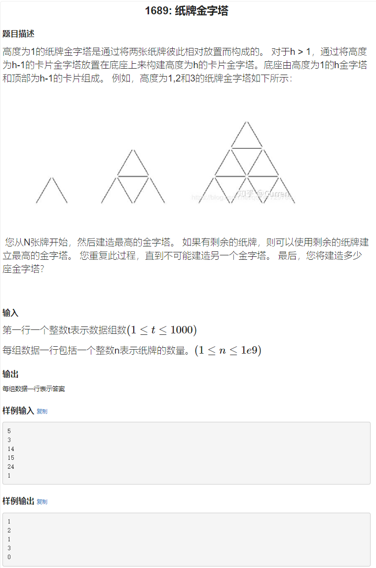 此题又臭又长,意为:拿n个扑克牌搭个最大三角形以此类推,问能搭多少个?