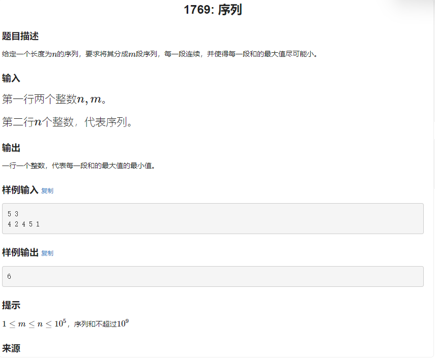 1 #include<bits/stdc++.h> 2 using namespace std; 3 const int N=1e6+10,N2=2e9; 4 int n,m,a[N]={0}; 5 int check(int k) 6 { 7 int ans=0,num=0; 8 for(int i=1;i<=n;i++) 9 { 10 if(a[i]>k) 11 { 12 return 0; 13 } 14 if(a[i]+num<=k) 15 { 16 num+=a[i]; 17 } 18 else 19 { 20 num=a[i]; 21 ans++; 22 } 23 } 24 ans++; 25 if(ans<=m) return 1; 26 else return 0; 27 } 28 int main() 29 { 30 scanf("%d%d",&n,&m); 31 for(int i=1;i<=n;i++) scanf("%d",&a[i]); 32 int r=N2,l=0; 33 while(l+1!=r) 34 { 35 int mid=(l+r)/2; 36 if(check(mid)==1) r=mid; 37 else l=mid; 38 } 39 printf("%d",r); 40 return 0; 41 }