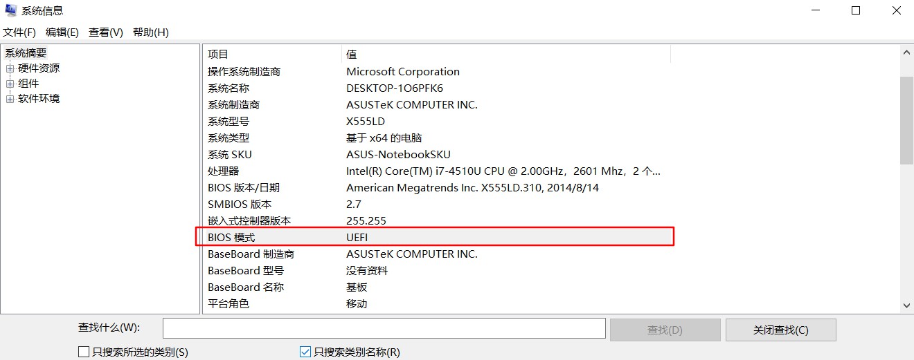 本人笔记本电脑配置是华硕X555LD,64位。接下来两点很重要,BIOS模式是UEFI,磁盘分区表结构是GPT。