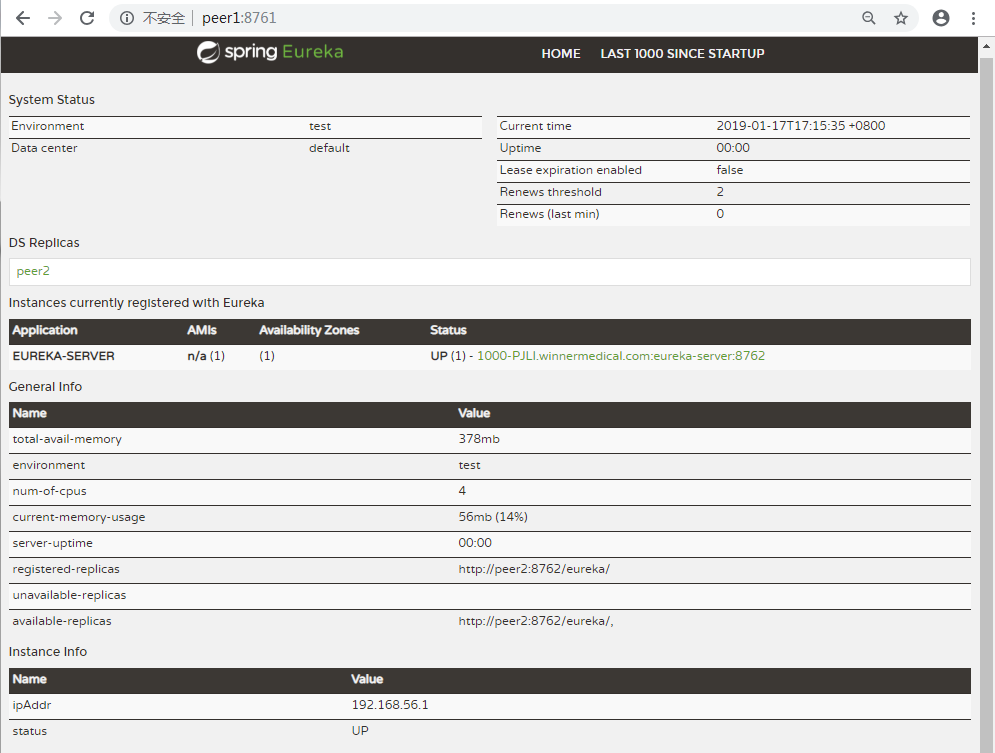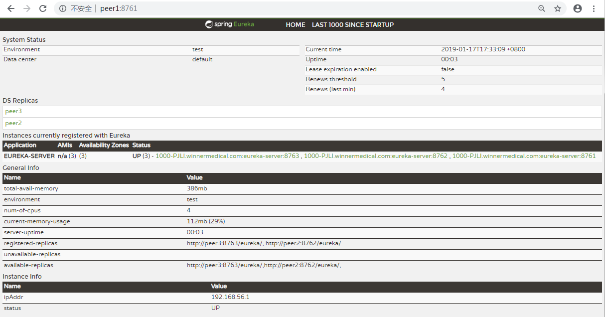 依次启动完成后,浏览器输入:http://peer1:8761/ 效果图如下: