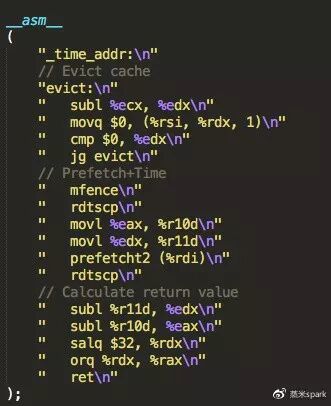 这是一段汇编,参数会传入想要预取的地址,然后利用 rdtscp 和 rdtscp 来统计指令执行的时间,并返回。然后,从内核可能的起始地址开始,不断执行这段汇编代码,直到找到内核的起始地址为止。