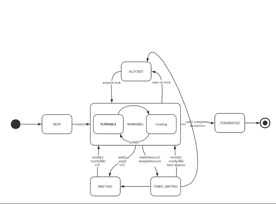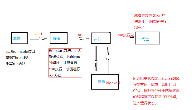 其他阻塞:通过调用线程的 sleep() 或 join() 发出了 I/O 请求时,线程就会进入到阻塞状态。当sleep() 状态超时,join() 等待线程终止或超时,或者 I/O 处理完毕,线程重新转入就绪状态。