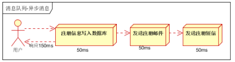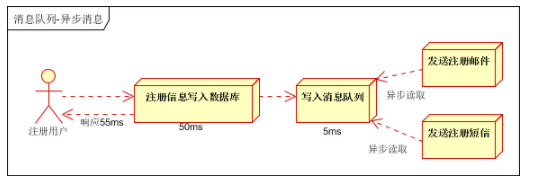 那么我们可以,通过发送mq的形式,将消息发送到短信系统和邮件系统处理。那么响应时间将会大大减少。前提是我不需要管理消息接送方,接送到消息后是否处理成功。