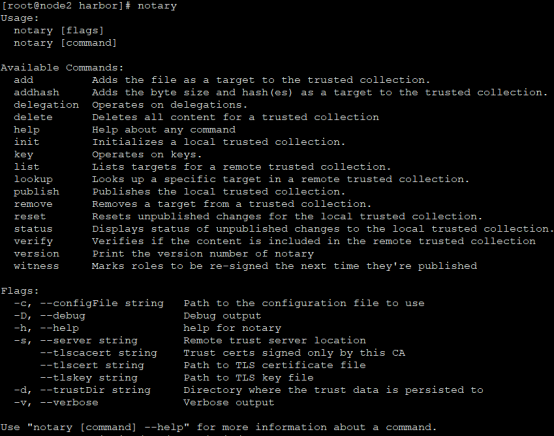 mkdir -p ~/.docker/tls/10.151.11.52:4443 cp ca.crt ~/.docker/tls/10.151.11.52:4443 #设置别名,执行notary命令时不需要输入-s和-d alias notary="notary -s https://10.151.11.52:4443 -d ~/.docker/trust --tlscacert /etc/docker/certs.d/10.151.11.52/ca.crt" #使用镜像签名时,在终端输入 export DOCKER_CONTENT_TRUST=1 export DOCKER_CONTENT_TRUST_SERVER=https://10.151.11.52:4443 #使用notary签名的镜像,必须移除签名后,才可以删除,不能直接删除签名镜像,移除签名时,需要输入登录harbor的用户名(admin)和密码,然后输入签名密码 notary remove -p 10.151.11.52:5000/notary/centos v4 #如果使用新建的用户取消签名,则删除信息数据,然后再使用harbor的admin移除签名 #找到对应的信息用户的key notary key list #删除该用户的key notary key remove 1091060d7bfd938dfa5be703fa057974f9322a4faef6f580334f3d6df44c02d1 #删除所有信息数据 notary delete registry.example.com/admin/demo --remote notary其它使用方式参考如下链接 https://docs.docker.com/notary/getting_started/