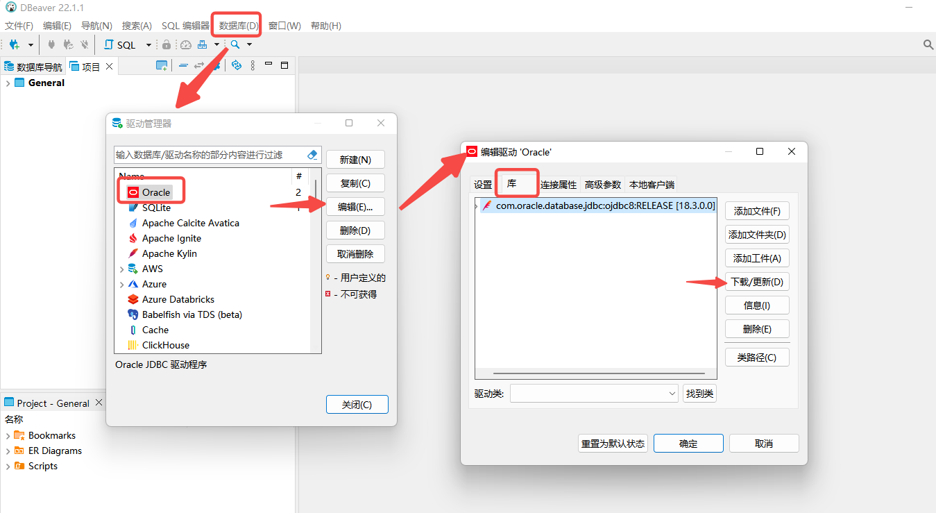 点击数据库,驱动管理器,选择Oracle,点击编辑,进入编辑驱动页面,点击库,选择驱动,点击下载/更新按钮,进入驱动设置页面,在页面中驱动版本选择与JDK一致的版本,点击保存。