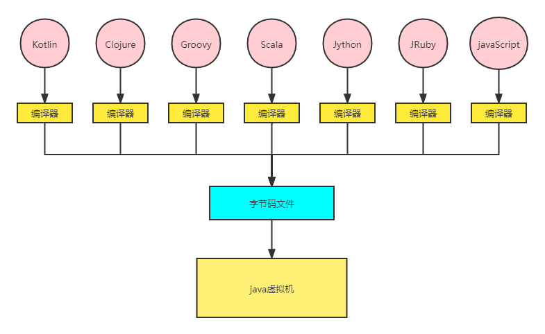 首先高级语言经过编译变成汇编语言,汇编语言再转化成机器指令即一串机器能识别的01二进制数然后交由机器执行。同样的执行java语言也需要类似的这样的一个过程。