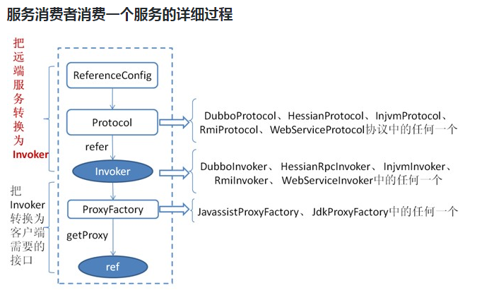1. refer方法主要完成:根据注册中心URL获取注册中心实例。 2. doRefer方法: - 获取RegistryDirectory对象,基于注册中心动态感知服务提供者的变化。 * 执行subscribe方法。 * 创建Invoker并返回
