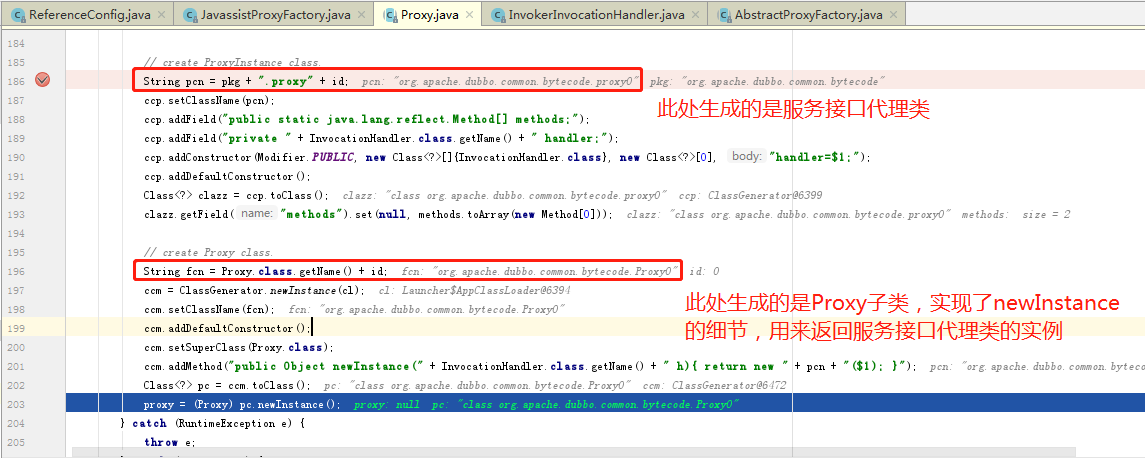 public <T> T getProxy(Invoker<T> invoker, Class<?>[] interfaces) { // 1. Proxy.getProxy(interfaces),利用Javassist动态生成Proxy子类,其中实现了newInstance的细节。 // 2. 调用Proxy子类的newInstance方法生成服务接口代理类的一个实例 return (T) Proxy.getProxy(interfaces).newInstance(new InvokerInvocationHandler(invoker)); }