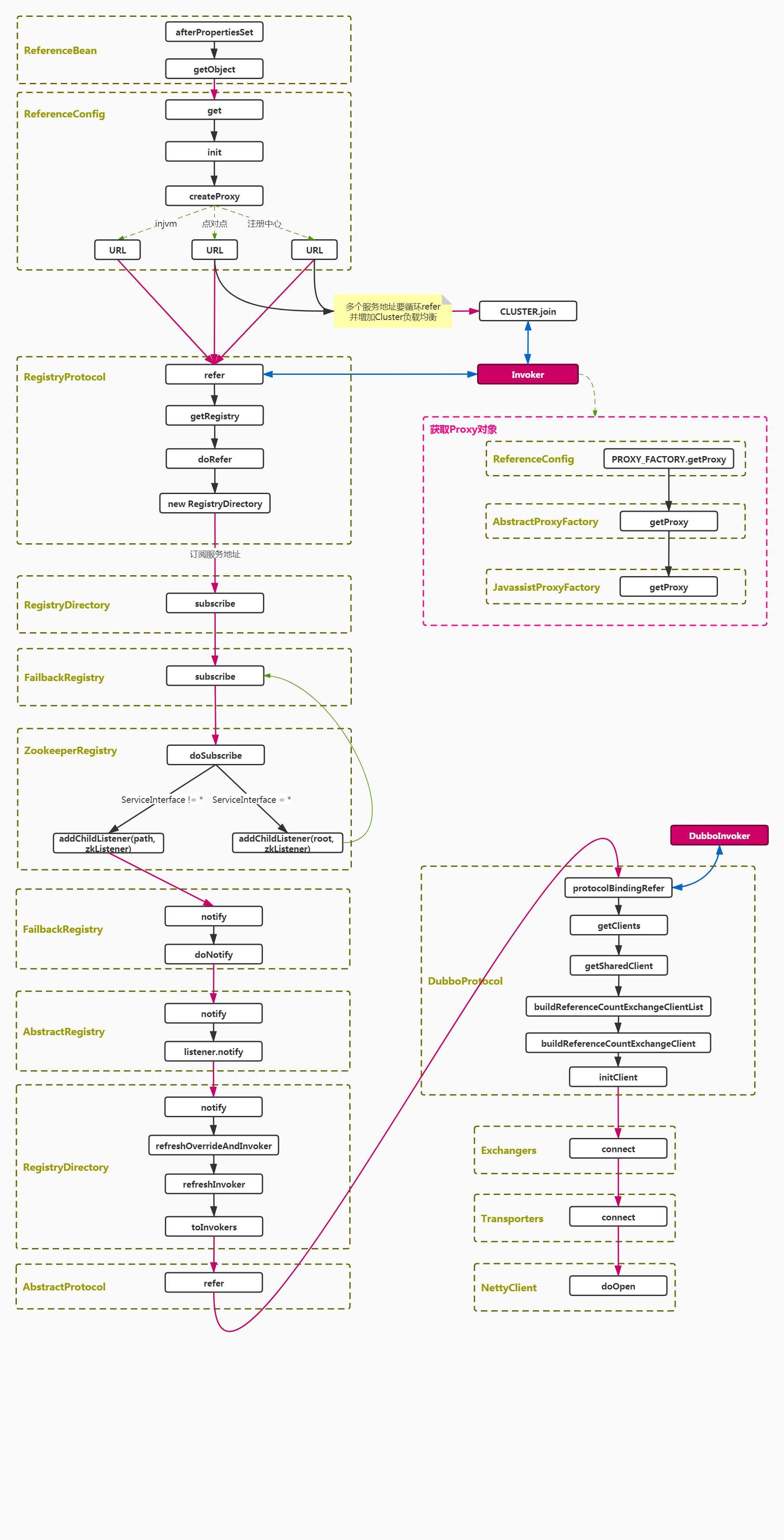 createProxy:396, ReferenceConfig refer:392, RegistryProtocol doRefer:411, RegistryProtocol subscribe:172, RegistryDirectory subscribe:295, FailbackRegistry doSubscribe:183, ZookeeperRegistry notify:360, FailbackRegistry doNotify:369, FailbackRegistry notify:418, AbstractRegistry notify:233, RegistryDirectory refreshOverrideAndInvoker:239, RegistryDirectory refreshInvoker:280, RegistryDirectory toInvokers:423, RegistryDirectory refer:91, AbstractProtocol protocolBindingRefer:407, DubboProtocol getClients:430, DubboProtocol getSharedClient:475, DubboProtocol buildReferenceCountExchangeClientList:550, DubboProtocol buildReferenceCountExchangeClient:563, DubboProtocol initClient:595, DubboProtocol connect:109, Exchangers connect:39, HeaderExchanger connect:75, Transporters connect:40, NettyTransporter <init>:80, NettyClient <init>:60, AbstractClient doOpen:91, NettyClient