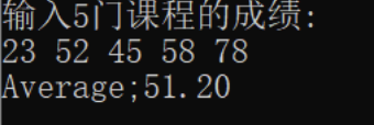 main(){float score[5],ave=0;int i;printf("输入5门课程的成绩:\n");for(i=0;i<=4;i++){scanf("%f",&score[i]);ave+=score[i];}ave/=5;printf("Average;%.2f\n",ave);}