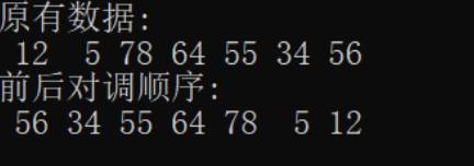 main(){int m[7]={12,5,78,64,55,34,56};int i,j,t;printf("原有数据:\n");for(i=0;i<=6;i++)printf("%3d",m[i]);printf("\n");for(i=0,j=6;i<=j;i++,j--){t=m[i];m[i]=m[j];m[j]=t;}printf("前后对调顺序:\n");for(i=0;i<=6;i++)printf("%3d",m[i]);printf("\n");}